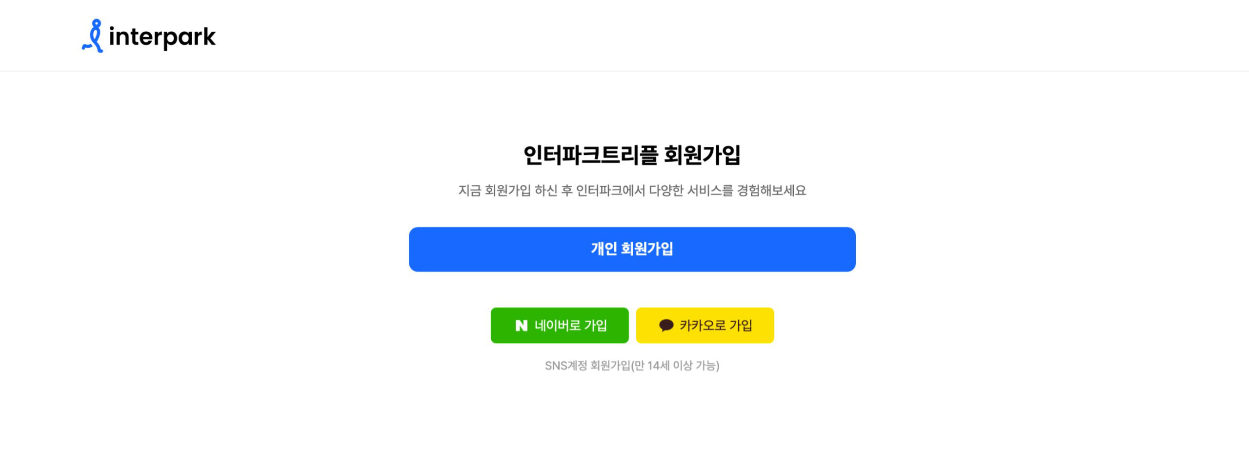 進入 interpark 的「韓國版」인터파크 티켓 (interpark.com) 網站後,就能看到平台上目前開放售票的各類藝文活動節目,點擊右上角的註冊會員(회원가입)就會進入選擇註冊方式的頁面。